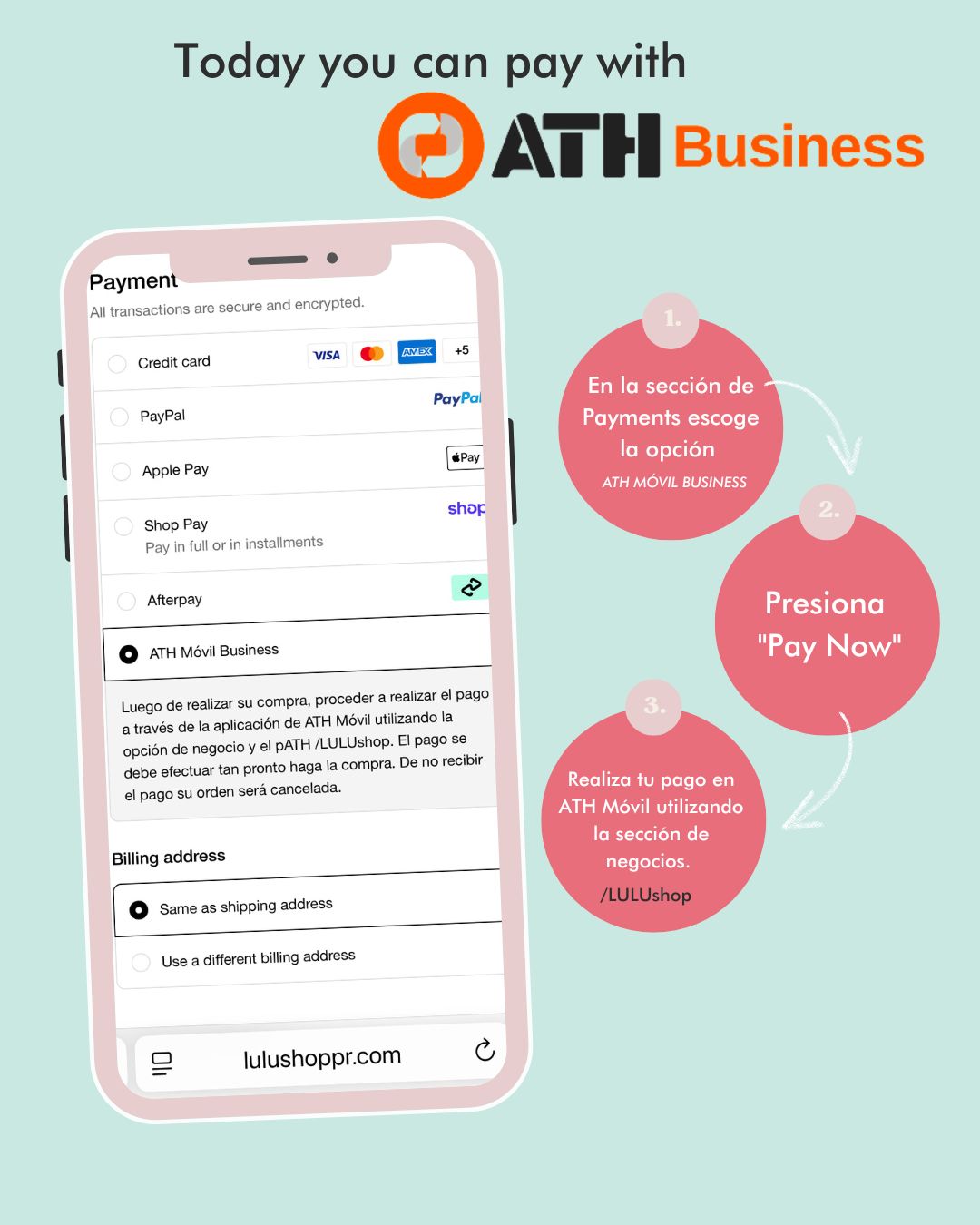 In the payment section, choose the ATH Móvil Business option, the press Pay Now. Once the order is completed, proceed to make the payment through the ATH Móvil platform. Choose the business option and enter the pATH/ LULUshop, the enter the total amount to pay and that's it.